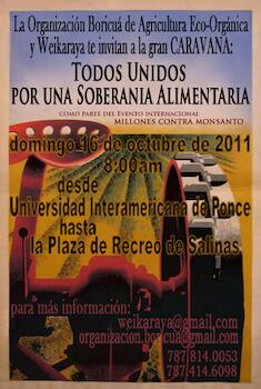 Los invitamos a participar de la caravana Todos Unidos por una Soberanía Alimentaria, a celebrarse el 16 de octubre a las 8 am. El lugar de encuentro será frente a la Universidad Interamericana de Ponce y seguiremos en caravana hacia la Plaza Pública de Salinas. Allí, Carmelo Ruiz orientará a los presentes con la charla Soberanía Alimentaria vs Transgénicos: Esperanza, Resistencia y Acción.