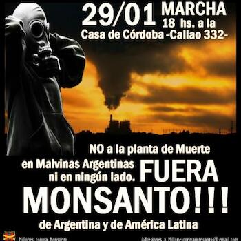 Nos movilizamos el martes 29 de enero, decididos que es el momento de lograr que se respeten nuestros derechos y por ellos estamos de pie, no queremos que Monsanto se instale en nuestras tierras de Malvinas Argentinas, como tampoco en nuestro país y en América Latina. Somos millones los que pedimos un proyecto de vida diferente, no queremos más pérdidas humanas, no más violencia para nuestro pueblo causado por multinacionales asesinas. Se cuestiona el agua, la tierra, el ambiente, el trabajo, la justicia, la salud... por eso el Progreso que Contamina, Envenena y Mata No es Progreso!